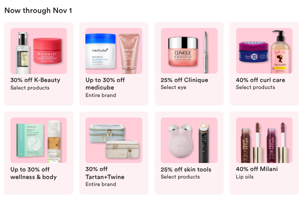 Let me break down what’s hot right now through November 1. Clinique eye products are 25% off, which is perfect timing if you need a new eye cream. Milani lip oils? 40% off. The entire Medicube brand is 30% off, and if you’re into K-Beauty, you can save 30% on select products too.