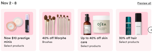 Now here’s where it gets good. The deals change weekly, so you can actually plan ahead. November 2 to 8 brings 40% off Morphe brushes, $10 prestige minis, and up to 40% off nail stuff. Perfect for stocking stuffers, just saying.