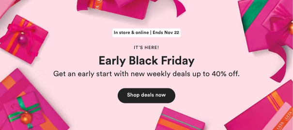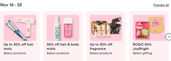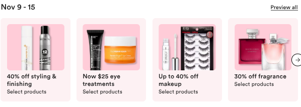 From November 9 to 15, the entire Mario Badescu line is 30% off. Eye treatments drop to $25, and fragrance gets a 30% discount. Then, November 16 to 22 is all about BOGO 50% on JoyBright gift sets, 30% off suncare, and deals on hair tools and body mists.